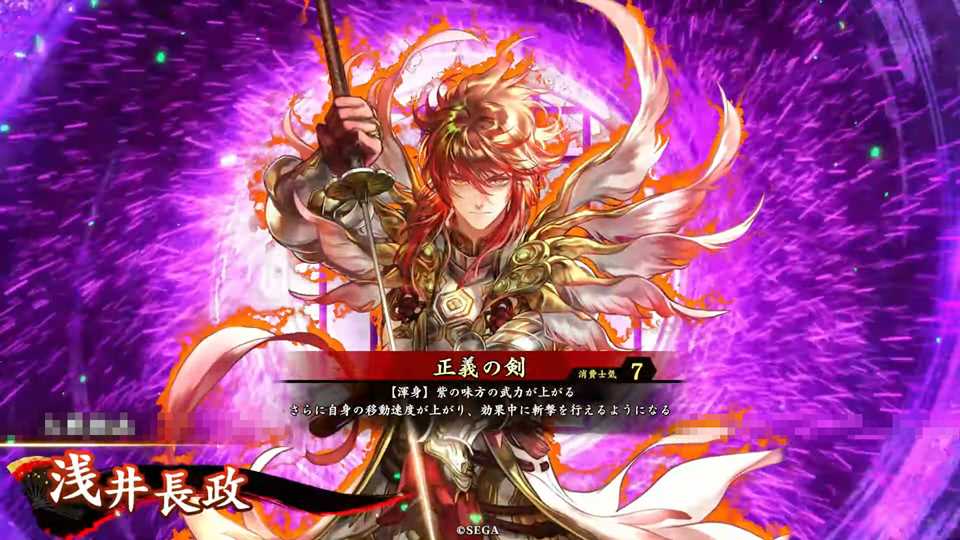 | 【渾身】(発動時の士気が必要士気に近いほど効果が大きい) 紫の味方の武力が上がる。一定以上武力が上がると、さらに自身の移動速度が上がり、効果中に斬撃を行えるようになる | ||||