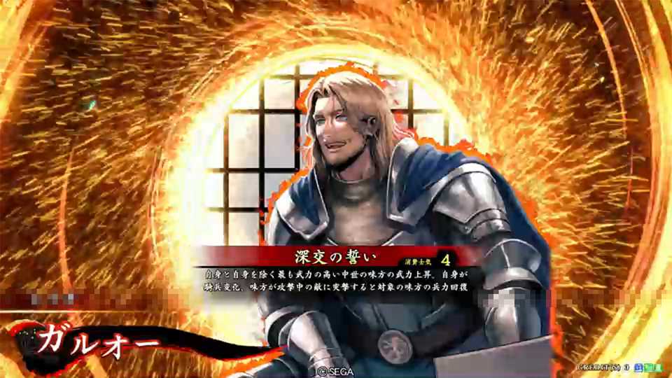 | 自身と、自身を除く最も武力の高い中世の味方の武力が上がる。さらに自身を除く対象の味方の兵種に応じて自身は以下の効果を得る 騎兵:弓兵になり、対象の味方が攻撃中の敵に自身が矢を当てている間、移動速度を下げる 槍兵:騎兵になり、対象の味方が攻撃中の敵に自身が突撃すると自身を除く対象の味方の兵力が回復する | ||||