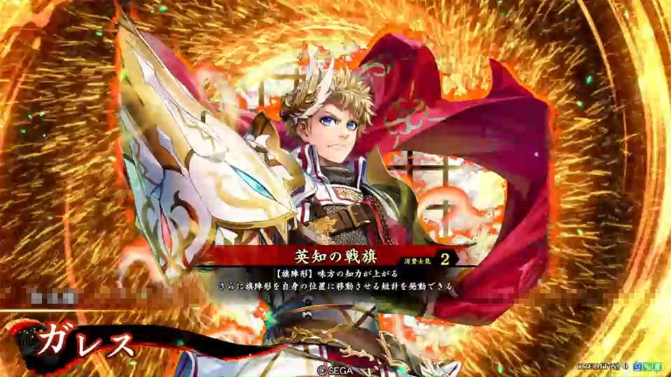 | 【旗陣形】(旗陣形が出現する。旗陣形は同時に複数発動でき、旗陣形を発動するたびに効果時間が延長され、旗陣形を繋いだ範囲に全ての効果が発生する。陣形と同時に発動できない) 味方の知力が上がる旗陣形を設置する。さらに以下の短計を発動できる 短計・再設置【0.5】:一定時間後に自身の発動した旗陣形を自身の位置に移動させる | ||||