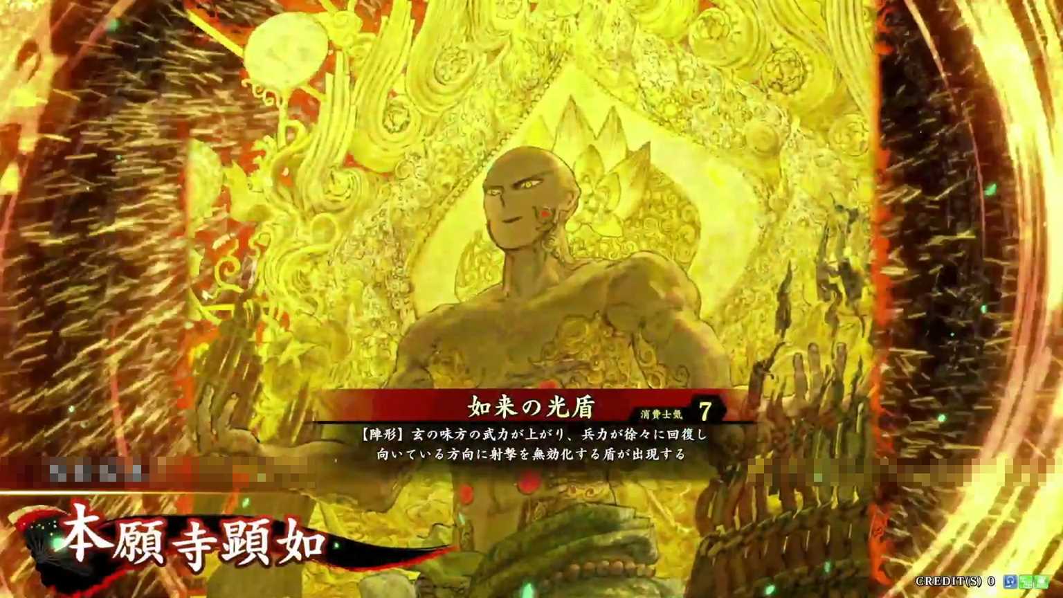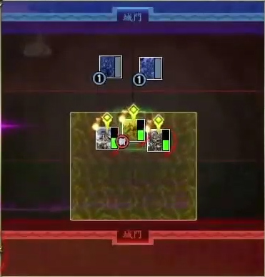 | 【陣形】(発動すると陣形が出現し、その中にいる間のみ効果が発生する。陣形は同時に複数発動できない) 玄の味方の武力が上がり、兵力が徐々に回復する。さらに向いている方向に射撃と竜射を無効化する盾が出現する | ||||
