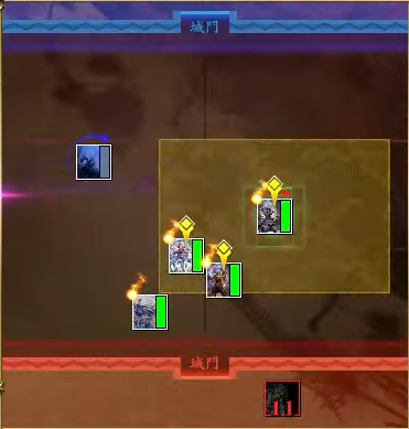 味方の武力が上がる。ただし兵力が徐々に減少する。味方の陣形の効果を受けている時に計略を発動すると、代わりに味方の武力が上がり、武力によるダメージを軽減する。ただし効果終了時に自身は撤退する