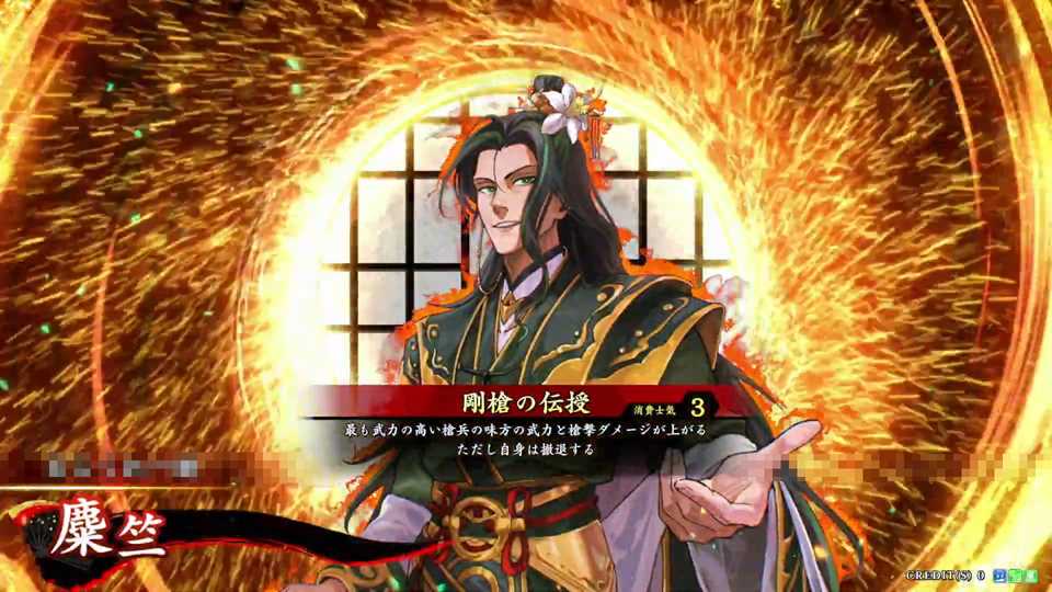 | 最も武力の高い槍兵の味方の武力と槍撃ダメージが上がる。ただし自身は撤退する | ||||