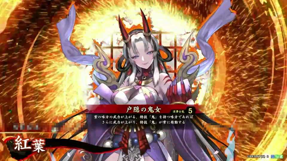 | 紫の味方の武力が上がる。特技「鬼」を持つ味方であれば、さらに武力が上がり、特技「鬼」が常に発動する | ||||