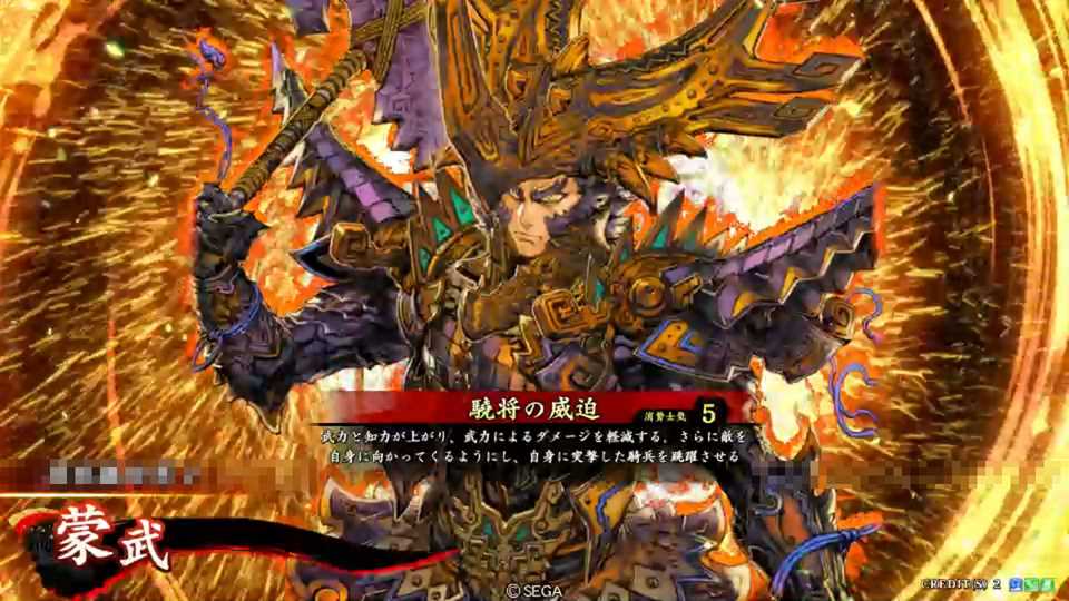 | 武力と知力が上がり、武力によるダメージを軽減する。さらに敵を自身に向かってくるようにし、自身に突撃した騎兵を跳躍させるようになる | ||||