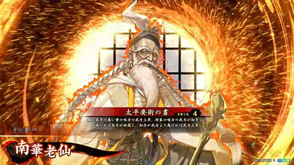 | 最も武力の高い黄の味方の武力が上がる。さらに対象の味方の武力が知力より高ければ兵力が回復し、知力が武力より高ければ武力が上がる | ||||