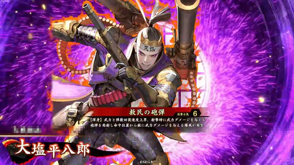 | 【渾身】(発動時の士気が必要士気に近いほど効果が大きい) 武力と弾数の回復速度が上がる。一定以上武力が上がると、さらにカードの向いている方向に射撃を行うと、代わりに武力ダメージを与える砲弾を発射し、砲弾が命中した位置を起点とした範囲に、敵に武力ダメージを与える爆風を発生させる。ダメージは互いの武力で上下する | ||||