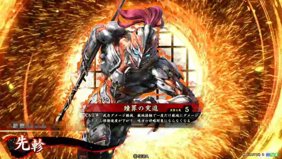 | 武力が上がり、武力によるダメージを軽減する。さらに敵城に接触すると一度だけ敵城にダメージを与える。ただし移動速度が下がり、味方の計略対象にならなくなる。この計略は城内にいる時のみ使用できる | ||||