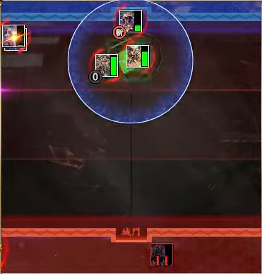 【陣形】(発動すると陣形が出現し、その中にいる間のみ効果が発生する。陣形は同時に複数発動できない) 武力と移動速度が上がる。ただし城に戻れなくなり、効果終了時に撤退する。さらに撤退時に敵の兵力を徐々に減少させる陣形を設置する