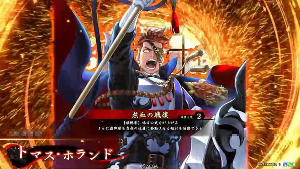 | 【旗陣形】(旗陣形が出現する。旗陣形は同時に複数発動でき、旗陣形を発動するたびに効果時間が延長され、旗陣形を繋いだ範囲に全ての効果が発生する。陣形と同時に発動できない) 味方の武力が上がる旗陣形を設置する。さらに以下の短計を発動できる 短計・再設置【0.5】:一定時間後に自身の発動した旗陣形を自身の位置に移動させる | ||||