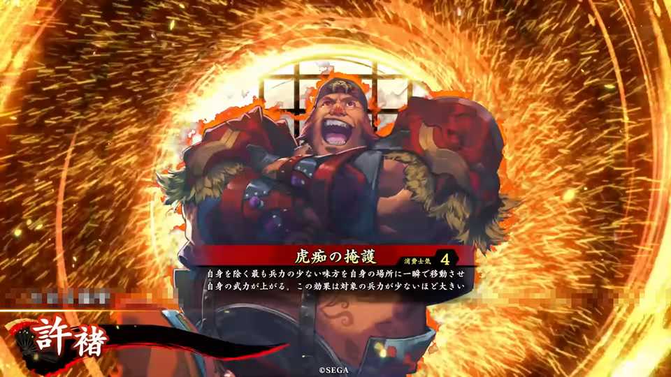 | 自身を除く最も兵力の少ない味方を自身の場所に一瞬で移動させ、自身の武力が上がる。この効果は対象の兵力が少ないほど大きい | ||||