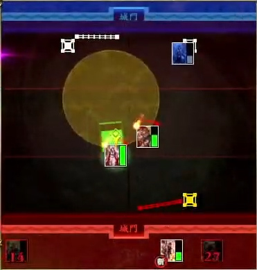 | 自身の知力が上がり、最も知力の高い緋の三国志の味方の武力を下げる。一定時間後に自身を除く対象の味方の武力が上がり、敵からダメージを受けない加護状態になる | ||||