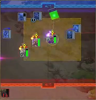 | 【渾身】(発動時の士気が必要士気に近いほど効果が大きい) 紫の味方の武力が上がり、兵力が回復する。一定以上武力が上がるとさらに移動速度が上がる | ||||